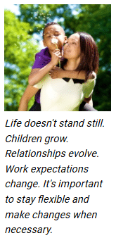Life doesn’t stand still. Children grow. Relationships evolve. Work expectations change. It’s important to stay flexible and make changes when necessary. Is your work schedule still manageable? Are your children thriving in the routine you’ve established? Are you happy with the division of household responsibilities between you and your spouse? Revisit these questions from time to time and keep the lines of communication open with your partner.