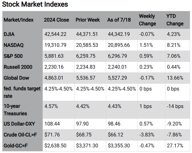 Stocks began last week mostly lower on mixed bank earnings and rising inflation data. While the June Consumer Price Index was in line with expectations (see below), it is worth noting that some imported goods, such as coffee, furniture, clothing, and appliances, climbed higher, which could be due to increased tariffs. However, favorable earnings data toward the end of last week and a better-than-expected retail sales report helped push stocks higher. For most of the week, investors weighed the White House’s push for higher tariffs on the European Union against strong corporate earnings and some favorable economic data. Among the market sectors, utilities and information technology outperformed, while health care, materials, and energy lagged. Long-term bond prices changed little, keeping yields steady. Crude oil prices slipped lower. The dollar edged higher for the second week in a row. Gold prices fell for the first time in the last three weeks.