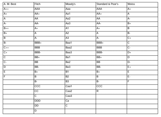 Each of the rating services uses a variation of an A through F scale to rate insurance companies. However, an A from one rating service does not necessarily equate to an A from another rating service. For instance, an A rating from A. M. Best is an “excellent” rating, while an A rating from Moody’s is only “good.” The following chart lists the ratings available from each company (from best to worst) and should give you a basic idea of how these ratings compare.