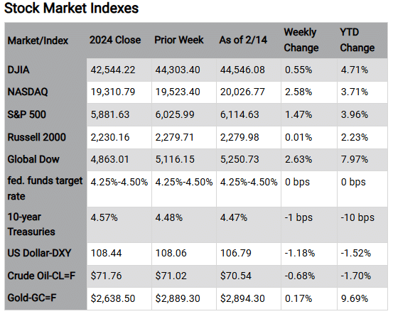 The markets ended the week higher, despite falling retail sales (see below) and ever-changing tariff proposals from the administration. Each of the benchmark indexes listed here gained ground, led by the Global Dow and the NASDAQ. Information technology and consumer staples led the market sectors, while consumer discretionary, health care, and financials underperformed. Crude oil prices trended lower, as did the dollar. Gold prices eked out a weekly gain.