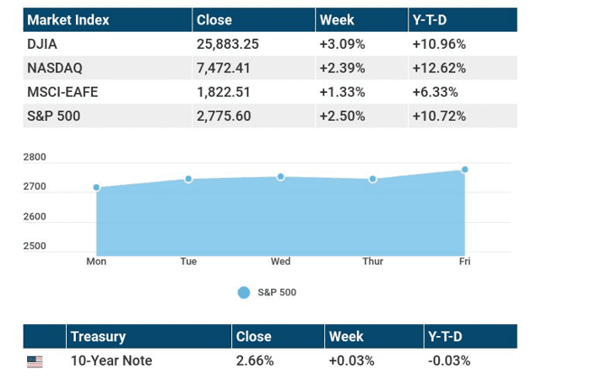 When the closing bell rang Friday, the S&P 500 settled at 2,775.60, after rising 2.50% in five days. The Dow Industrials gained 3.09% to close Friday at 25,883.25. The Nasdaq Composite improved 2.39% to 7,472.41.1,2