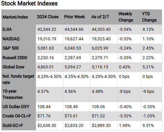 The markets closed lower last week as investors reacted to the possibility of additional tariffs from the Trump administration, the potential for rising inflation, a weak earnings report from a major Megacap, and a lower-than-expected jobs report. Of the indexes listed here, only the Global Dow managed to eke out a weekly gain. The remaining indexes closed lower, led by the Dow and the NASDAQ. Ten-year Treasury yields rebounded last Friday, but not enough to keep from ending last week lower. Crude oil prices declined nearly 3.5%, primarily due to increasing trade tensions, particularly with China.