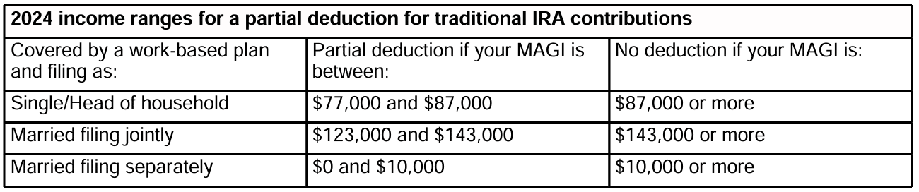 If you and your spouse were not covered by a work-based retirement plan in 2024, your traditional IRA contributions are fully tax deductible. If you were covered by a work-based plan, you can take a full deduction if you’re single and had a 2024 modified adjusted gross income (MAGI) of $77,000 or less or married filing jointly with a 2024 MAGI of $123,000 or less. You may be able to take a partial deduction if your MAGI fell within the following limits.