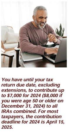 The tax filing deadline is fast approaching, which means time is running out to fund an IRA for 2024. If you had earned income last year, you may be able to contribute up to $7,000 for 2024 ($8,000 for those age 50 or older by December 31, 2024) up until your tax return due date, excluding extensions. For most people, that date is Tuesday, April 15, 2025.